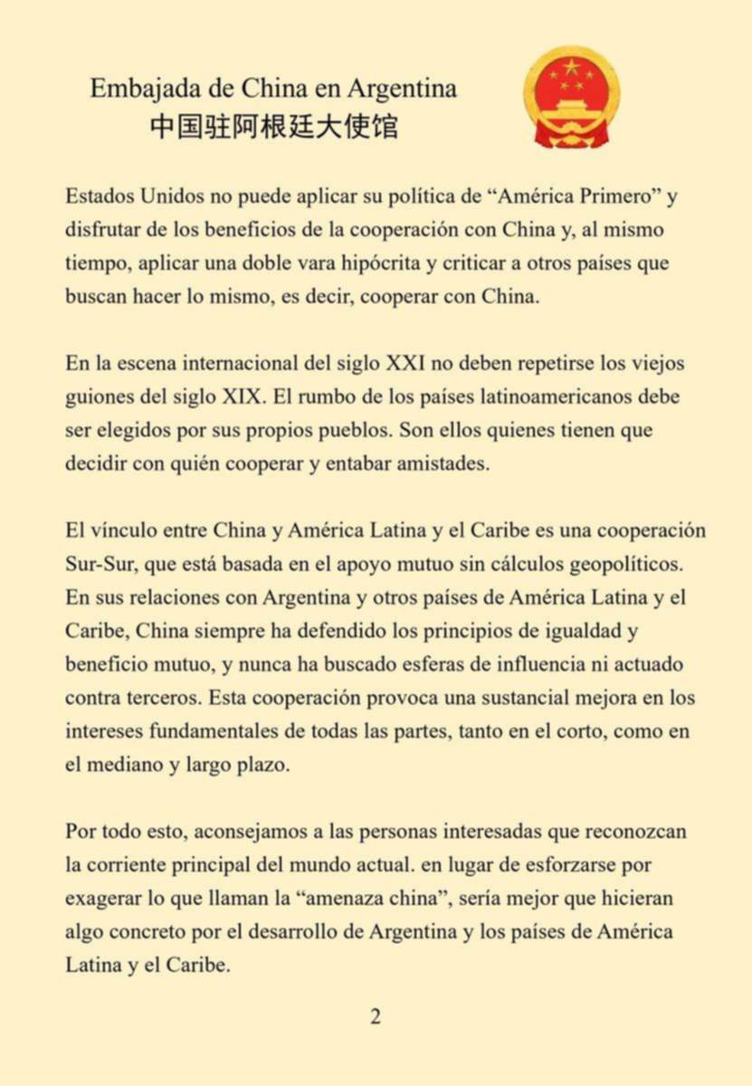 También cuestionaron la postura de Washington al afirmar que no puede “aplicar su política de ‘América Primero’ y, al mismo tiempo, criticar a otros países que cooperan con China”. En ese sentido, defendieron el vínculo con Argentina y la región como una cooperación “basada en el beneficio mutuo” y sin intenciones geopolíticas.