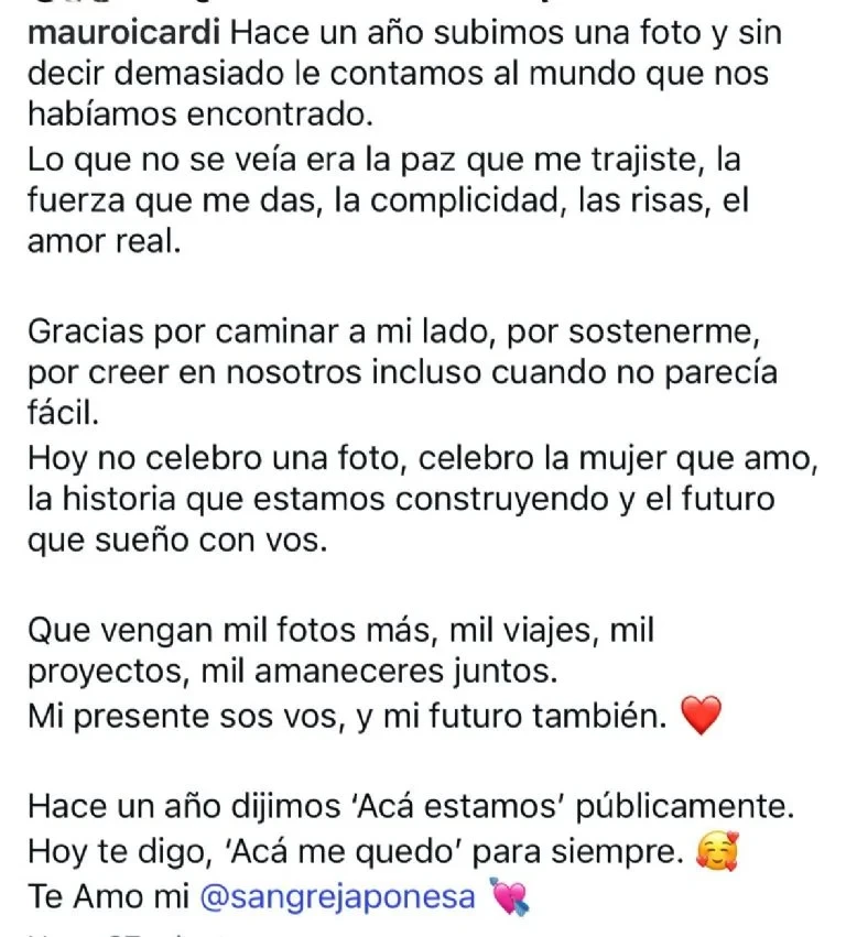 Cabe recordar que un año atrás, cuando confirmaron su romance, Mauro también había acompañado la foto con una larga reflexión sobre el destino, los encuentros inesperados y la certeza de haber encontrado su lugar. Hoy, doce meses después, volvió a ratificar ese sentimiento con una nueva carta que dejó en claro que el romance sigue firme.