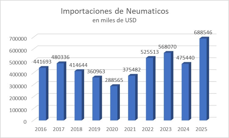 En el último año, el ingreso de neumáticos creció de u$s 475.440 millones en 2024 a u$s 688.564 millones en 2025.
