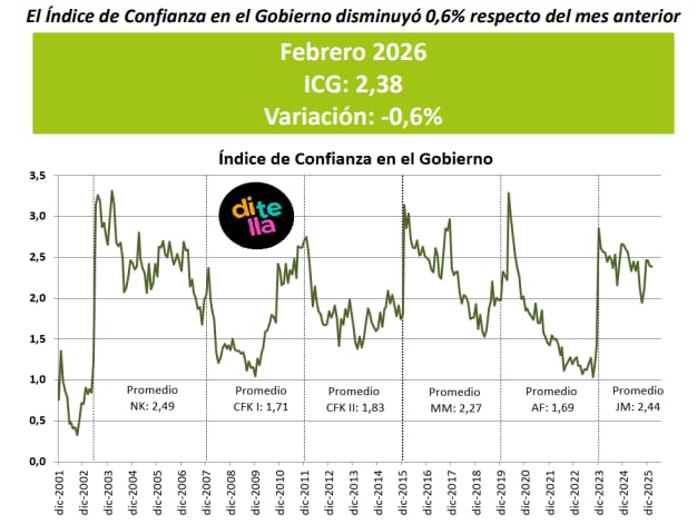 En ese contexto, el Índice de Confianza en el Gobierno (ICG), que elabora la Universidad Torcuato Di Tella, marcó 2,38 puntos en febrero y, pese a bajar 0,6% mensual, se mantiene dentro del rango promedio de la actual gestión. En términos interanuales, el indicador muestra una baja del 6,8%.