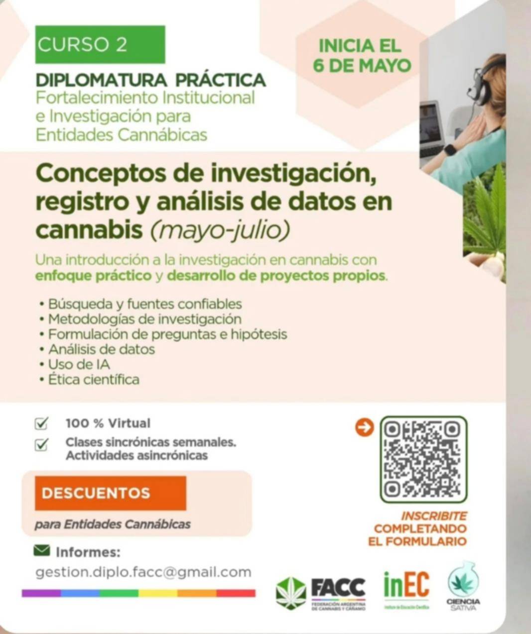 En el marco de la Diplomatura Práctica en Fortalecimiento Institucional e Investigación para Entidades Cannábicas, se encuentra abierta la inscripción al segundo curso del programa, titulado “Conceptos de investigación, registro y análisis de datos en cannabis”, que comenzará el próximo 6 de mayo.