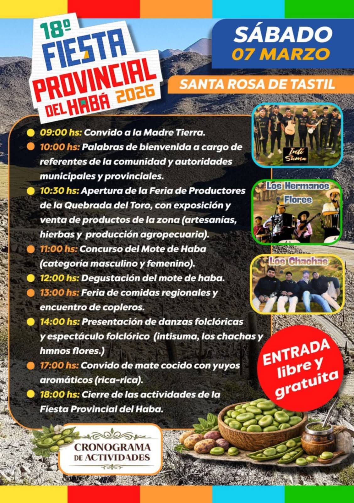 Con una propuesta que combina tradición, gastronomía y cultura andina, la localidad de Santa Rosa de Tastil se prepara para vivir este sábado 7 de marzo la 18ª edición de la Fiesta Provincial del Haba, un evento que ya se consolidó como uno de los encuentros más esperados del calendario cultural del interior salteño.