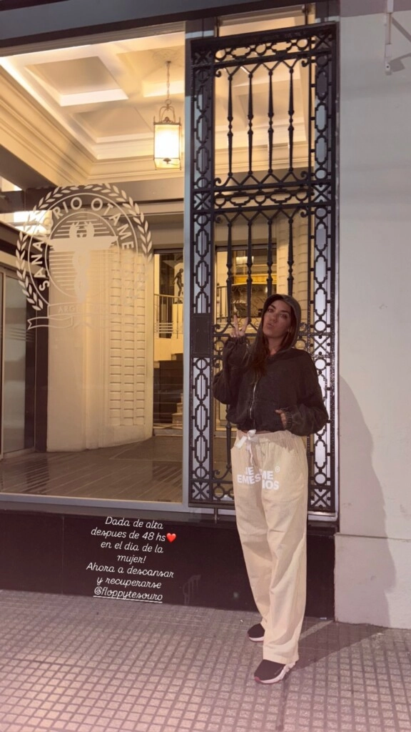 Sobre una foto donde se la puede ver parada en la entrada al sanatorio y como parte de un reposteo de su pareja, se confirmó la feliz noticia. “Dada de alta después de 48 horas, en el Día de la Mujer. Ahora a descansar y recuperarse”, se podía leer en la historia que subió Salvador a sus redes y que la propia Floppy subió a su perfil.