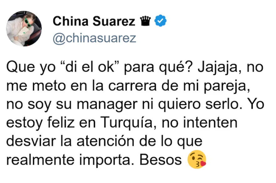 “¿Que yo ‘di el ok’ para qué? Jajaja. No me meto en la carrera de mi pareja, no soy su manager ni quiero serlo”, lanzó la actriz, diferenciándose rotundamente de Wanda, quien se ocupaba personalmente de cerrarle los contratos a Mau mientras estaban juntos. Para que no queden dudas, la China sumó: “Yo estoy feliz en Turquía, no intenten desviar la atención de lo que realmente importa. Besos”.