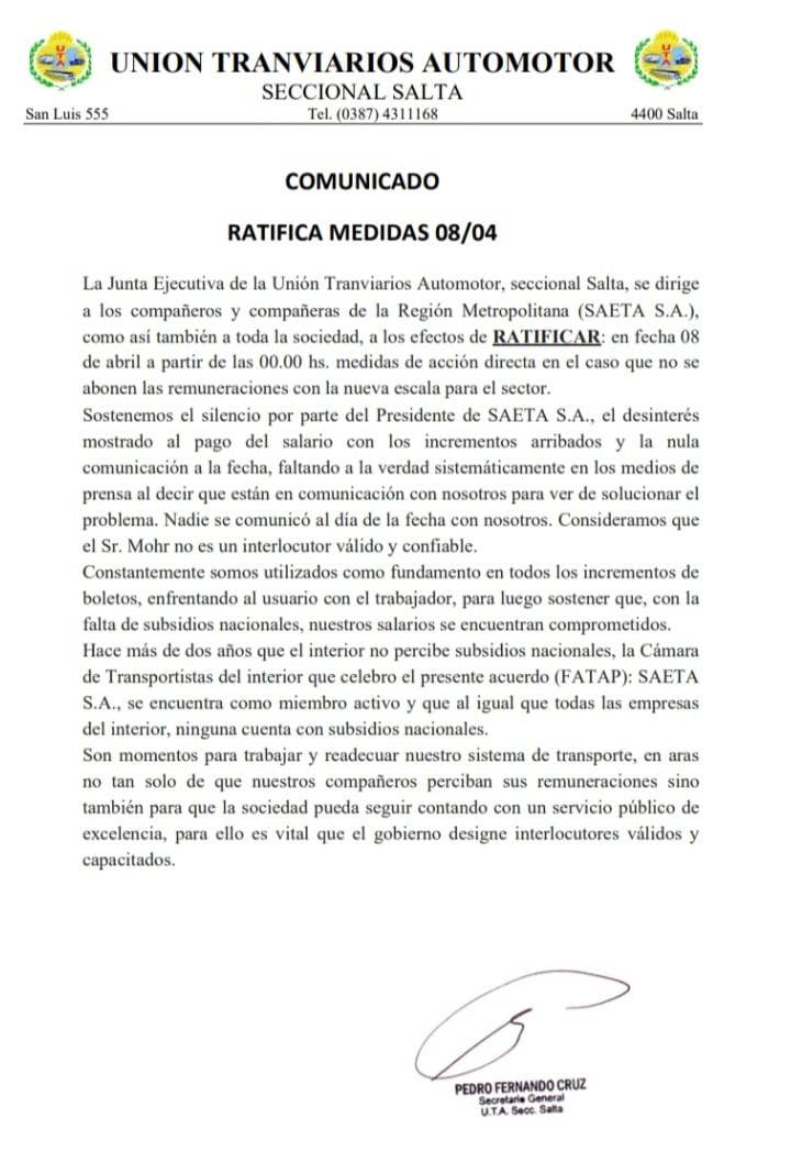 En el documento, la UTA cuestionó con dureza a la empresa estatal. Desde el gremio señalaron el “silencio” de SAETA frente al reclamo salarial y aseguraron que no existió comunicación formal para resolver el conflicto.
