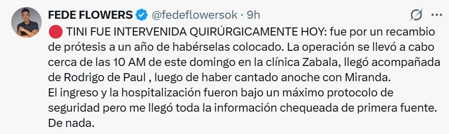 “Tini fue intervenida quirúrgicamente hoy, fue por un recambio de prótesis a un año de habérselas colocado. La operación se llevó a cabo cerca de las 10 AM de este domingo en la clínica Zabala, llegó acompañada de Rodrigo de Paul, luego de haber cantado anoche con Miranda”, publicó Flowers en Twitter en la noche del domingo.