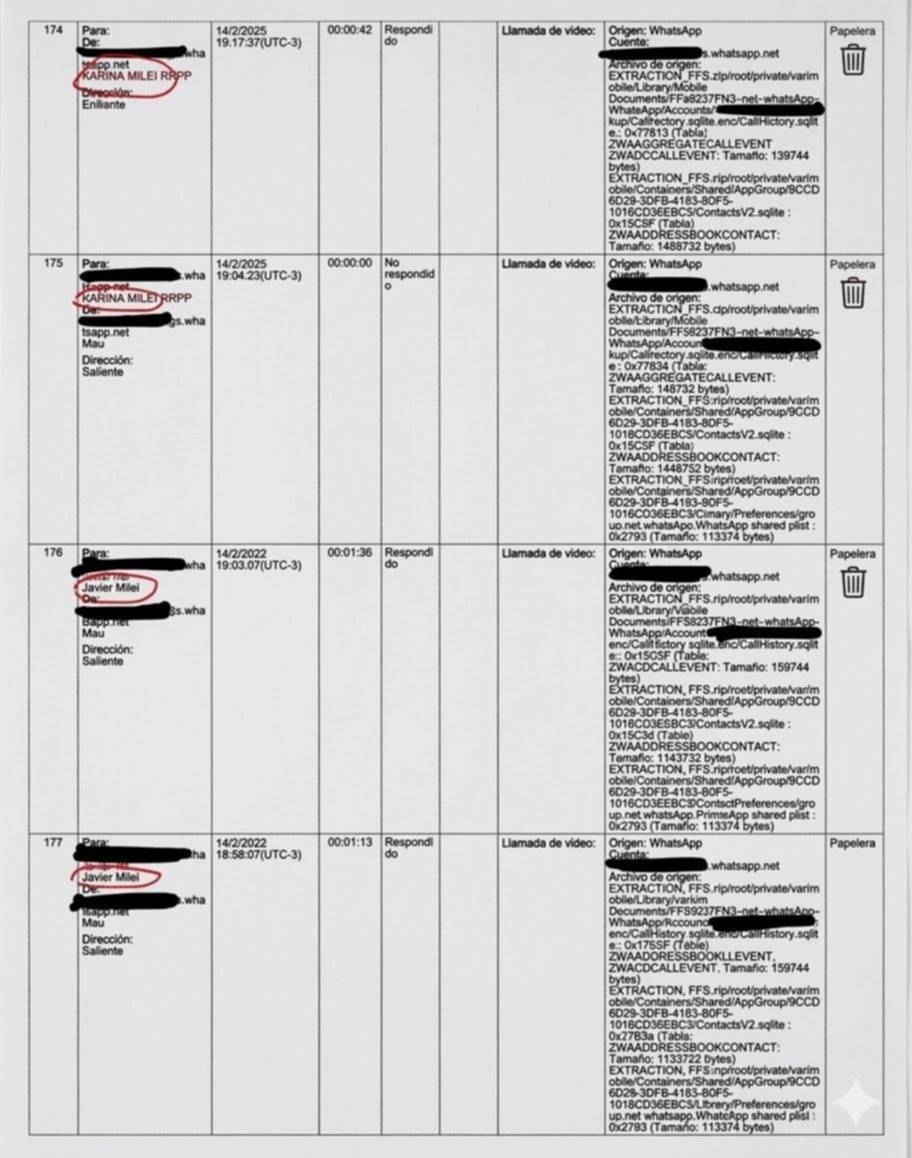 Las autoridades judiciales señalaron que estos registros fueron recuperados mediante técnicas de análisis forense, ya que las videollamadas habían sido eliminadas y posteriormente recuperadas desde la papelera de WhatsApp.