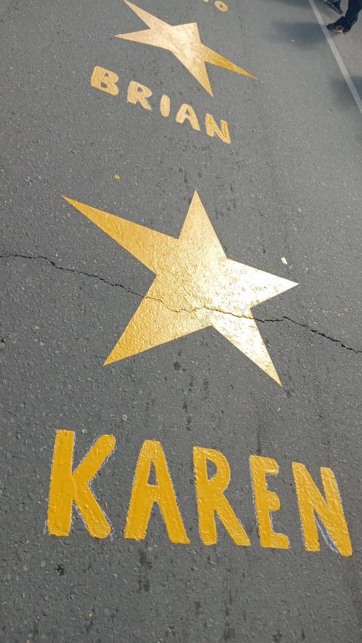 Mientras la pintura comenzaba a secarse sobre el asfalto, las familias permanecían en el lugar. Las cinco estrellas amarillas quedaron allí como advertencia y como memoria.