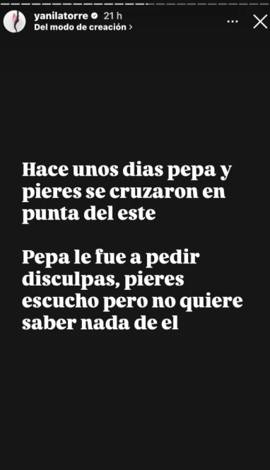 En medio de la tensión, Pepa hizo un movimiento y a través de sus historias de Instagram publicó una foto junto a Pieres y otros amigos en Punta del Este. El gesto fue entendido como una forma de calmar las aguas y desmentir que estén peleados. Sin embargo, la bomba parece ya estar detonada desde hace tiempo.